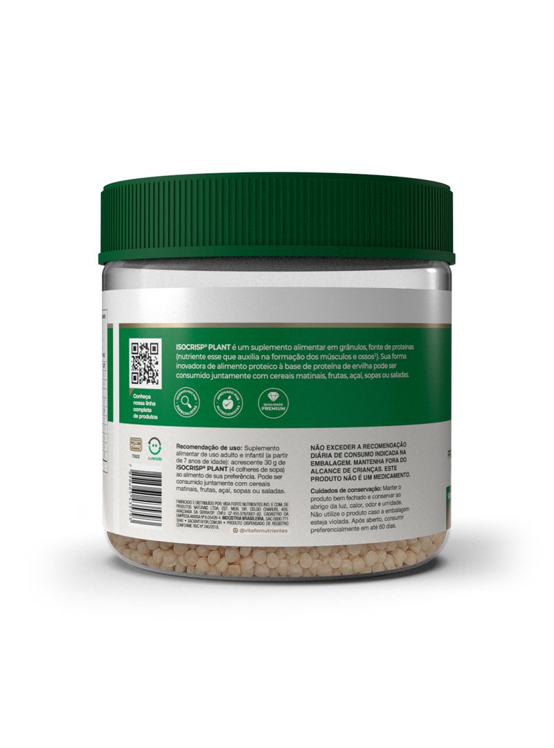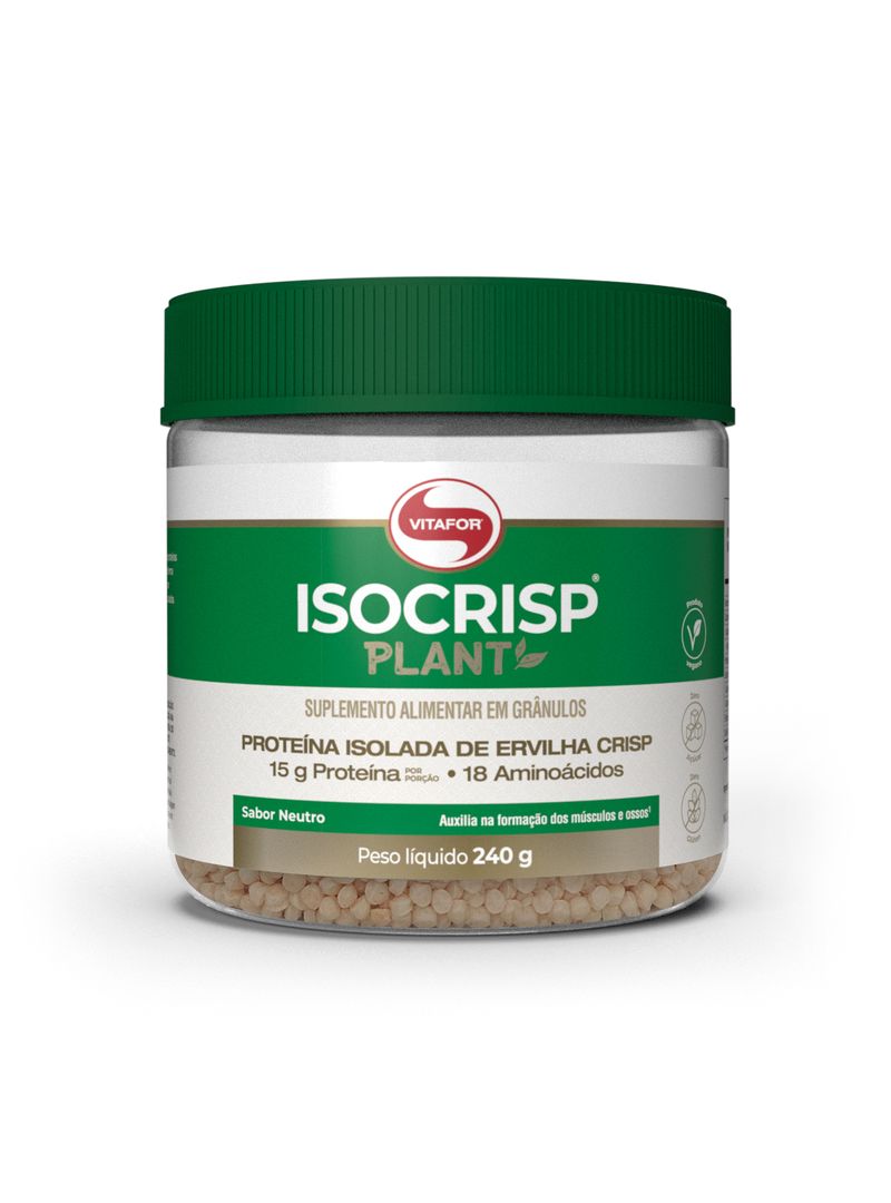 ISOCRISP® PLANT Vitafor é um suplemento alimentar em grânulos, fonte de proteínas (nutriente esse que auxilia na formação dos músculos e ossos). Sua forma inovadora de alimento proteico à base de proteína de ervilha pode ser consumida juntamente com cereais matinais, frutas, açaí, sopas ou saladas.