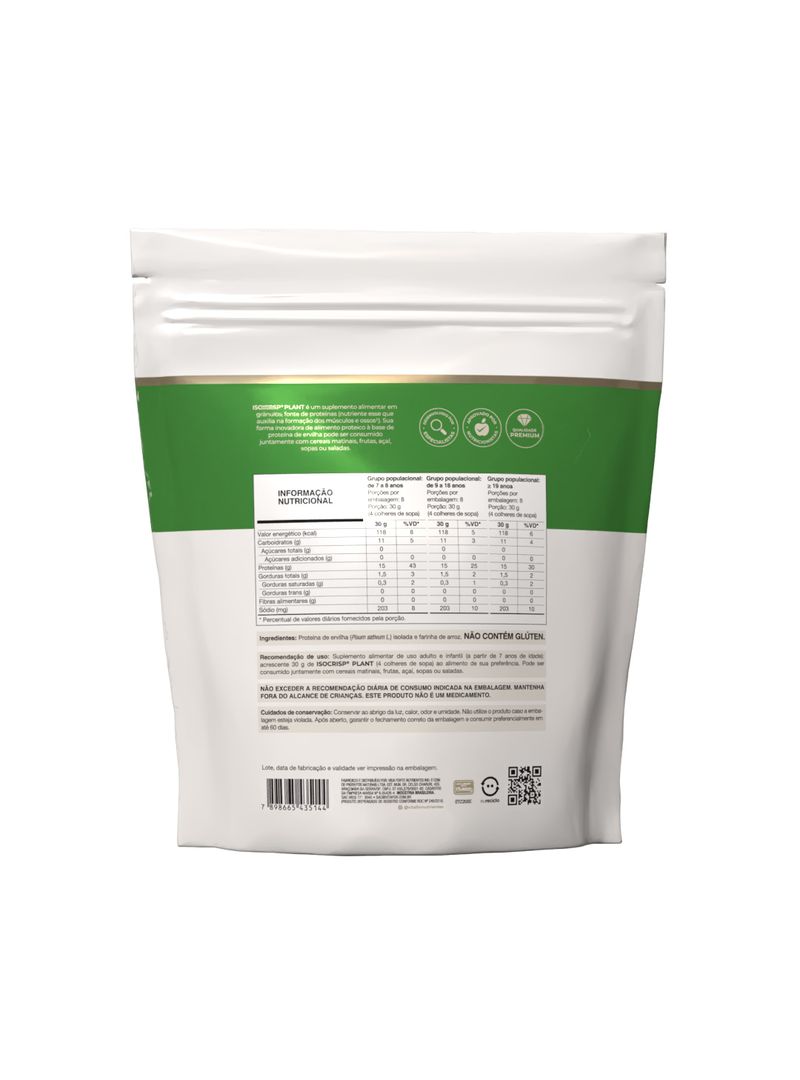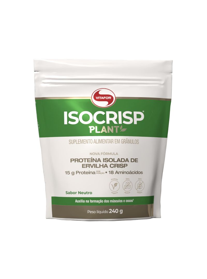 ISOCRISP® PLANT Vitafor é um suplemento alimentar em grânulos, fonte de proteínas (nutriente esse que auxilia na formação dos músculos e ossos). Sua forma inovadora de alimento proteico à base de proteína de ervilha pode ser consumida juntamente com cereais matinais, frutas, açaí, sopas ou saladas.
