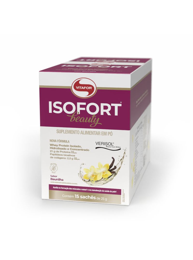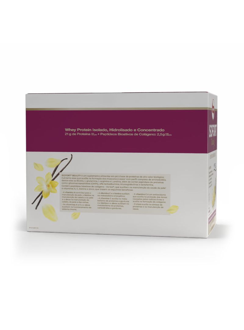 ISOFORT® BEAUTY é um suplemento alimentar composto de proteínas de alto valor biológico e possui aminoácidos dentre eles os BCAAs, L-glutamina, L-arginina e L-prolina, além de conter peptídeos de proteínas como: glicomacropeptídeos (GMPs), alfa-lactoalbumina, imunoglobulinas e lactoferrina. Os peptídeos bioativos de colágeno hidrolisado com peso molecular médio de 2kDa auxiliam na manutenção da saúde da pele.