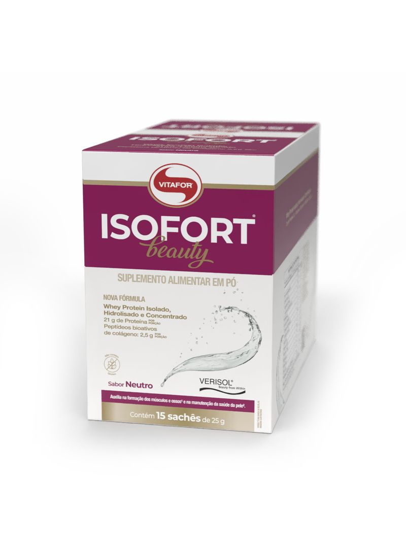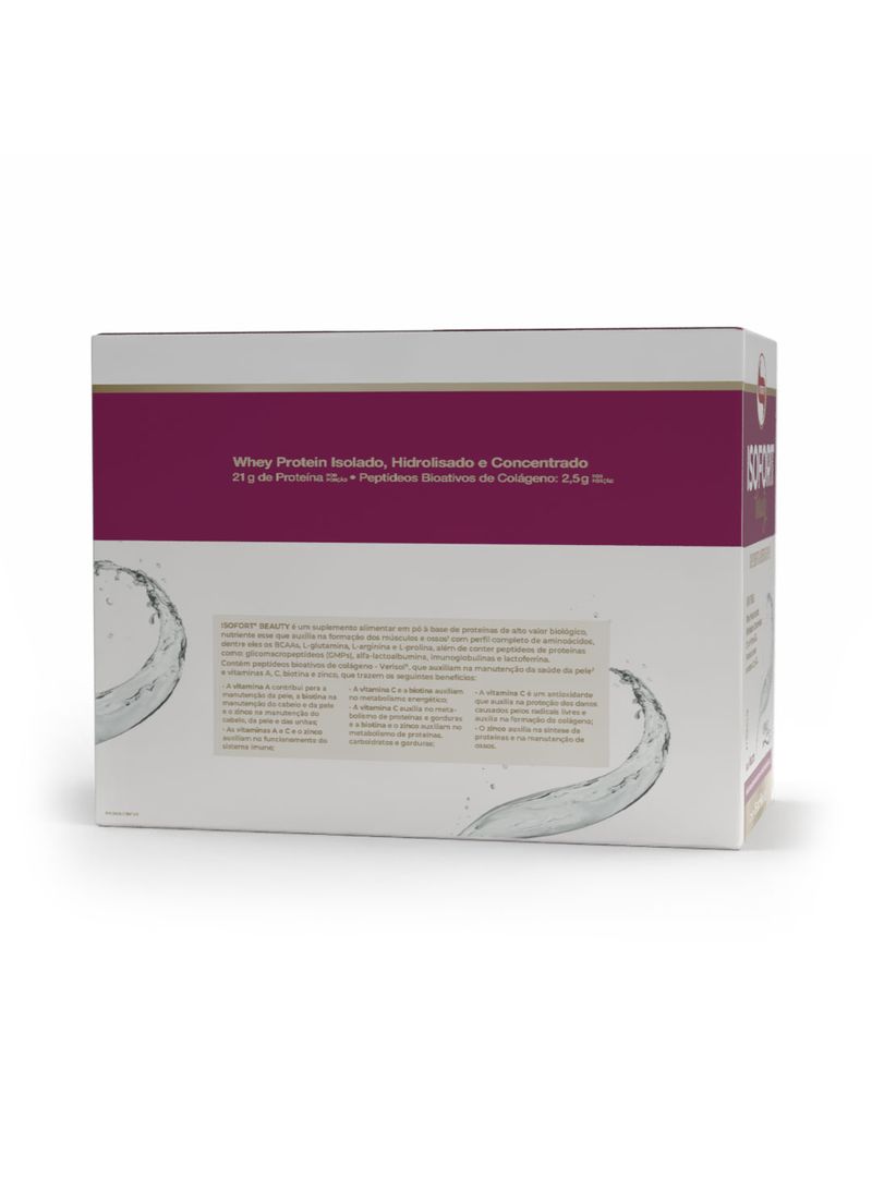 ISOFORT® BEAUTY é um suplemento alimentar composto de proteínas de alto valor biológico e possui aminoácidos dentre eles os BCAAs, L-glutamina, L-arginina e L-prolina, além de conter peptídeos de proteínas como: glicomacropeptídeos (GMPs), alfa-lactoalbumina, imunoglobulinas e lactoferrina. Os peptídeos bioativos de colágeno hidrolisado com peso molecular médio de 2kDa auxiliam na manutenção da saúde da pele.