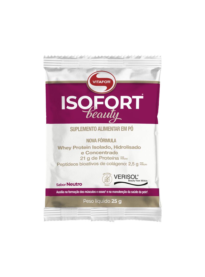 ISOFORT® BEAUTY é um suplemento alimentar composto de proteínas de alto valor biológico e possui aminoácidos dentre eles os BCAAs, L-glutamina, L-arginina e L-prolina, além de conter peptídeos de proteínas como: glicomacropeptídeos (GMPs), alfa-lactoalbumina, imunoglobulinas e lactoferrina. Os peptídeos bioativos de colágeno hidrolisado com peso molecular médio de 2kDa auxiliam na manutenção da saúde da pele.