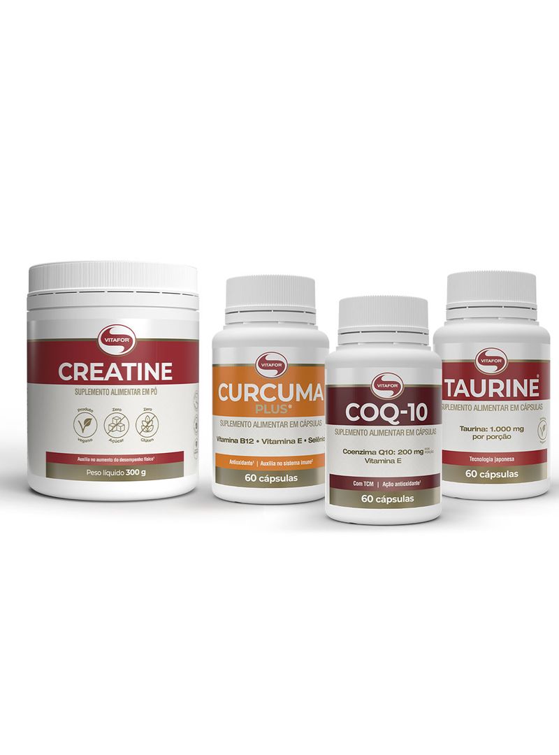 Kit Cognição e longevidade é composto pelos produtos: Creatine – 300g, Curcuma Plus – 60 cap, Taurine – 60 cap e Coenzima Q10 – 60 cap (200mg p/ porção).