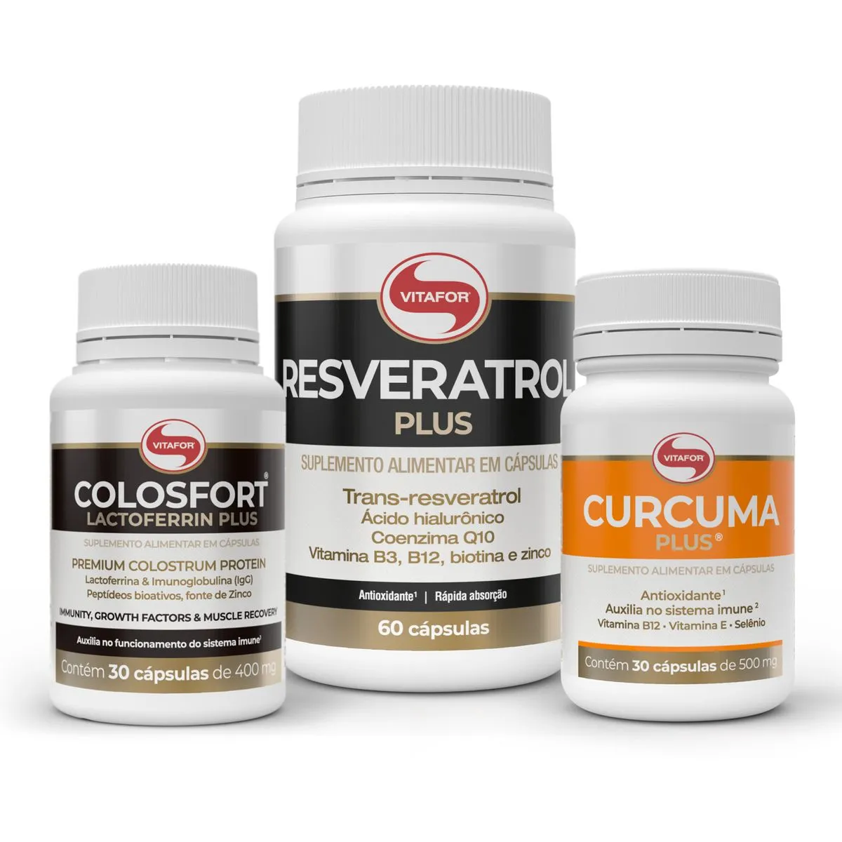 Kit Premium Plus foi pensando para quem quer envelhecer bem! É composto pelos produtos: Colosfort Lactoferrin Plus 30 cáp, Resveratrol Plus 60 cáp e Curcuma Plus 60
