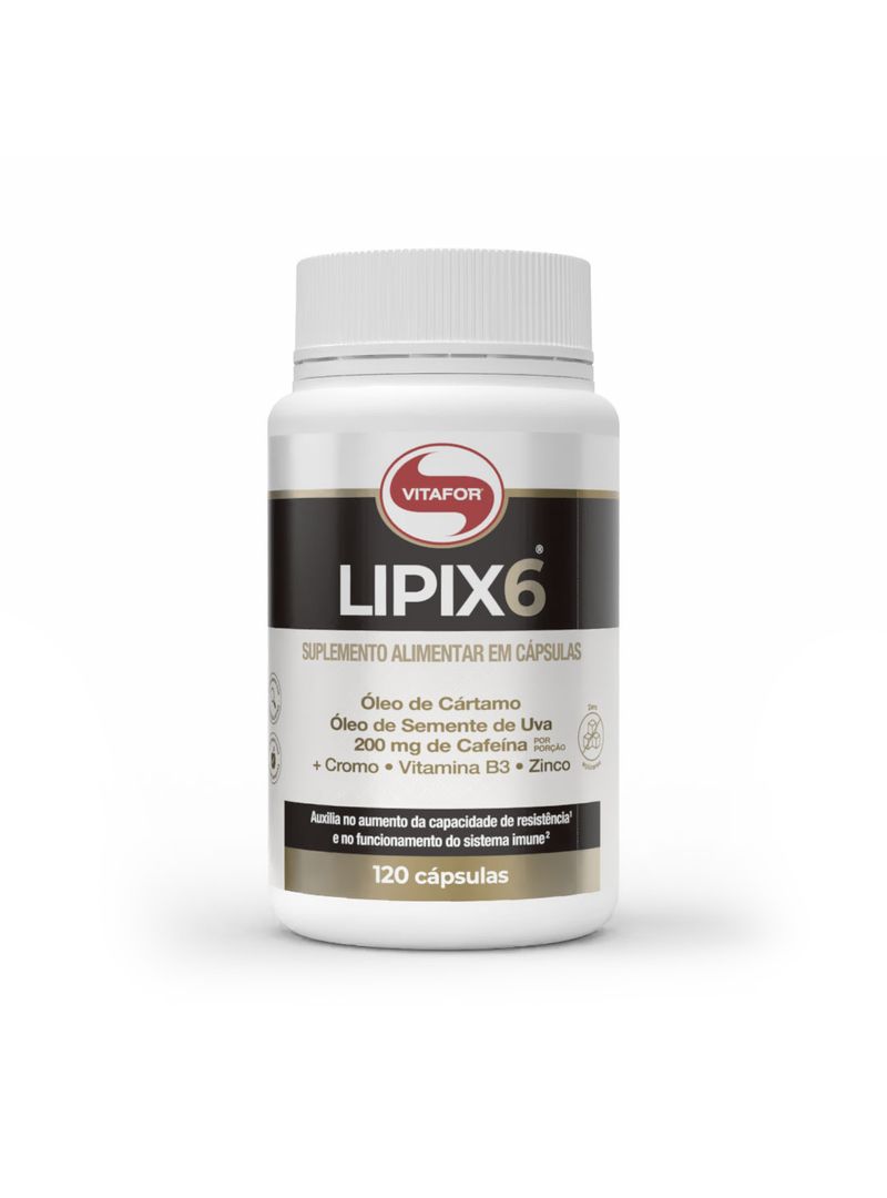 Lipix 6® é um suplemento alimentar à base de cafeína, óleo de cártamo, óleo de semente de uva, vitaminas e minerais.