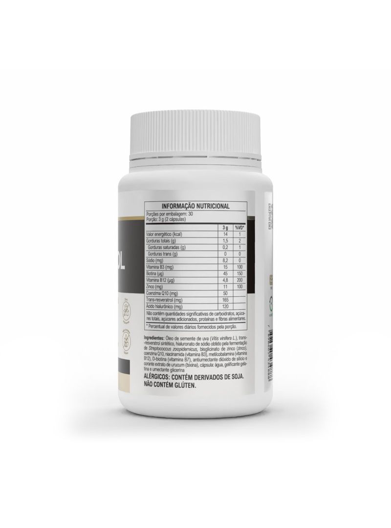 RESVERATROL PLUS® é um suplemento alimentar a base de óleo de semente de uva (Vitis vinifera L.), trans-resveratrol, ácido hialurônico, coenzima Q10, vitaminas B3, B12, biotina e zinco.
