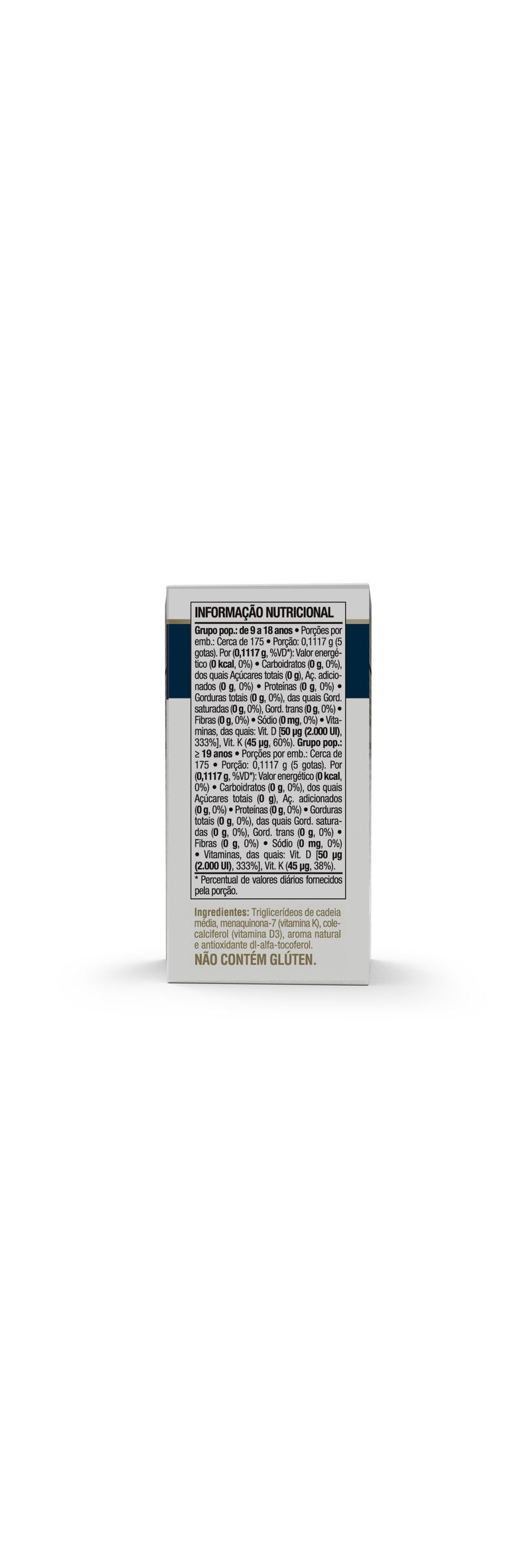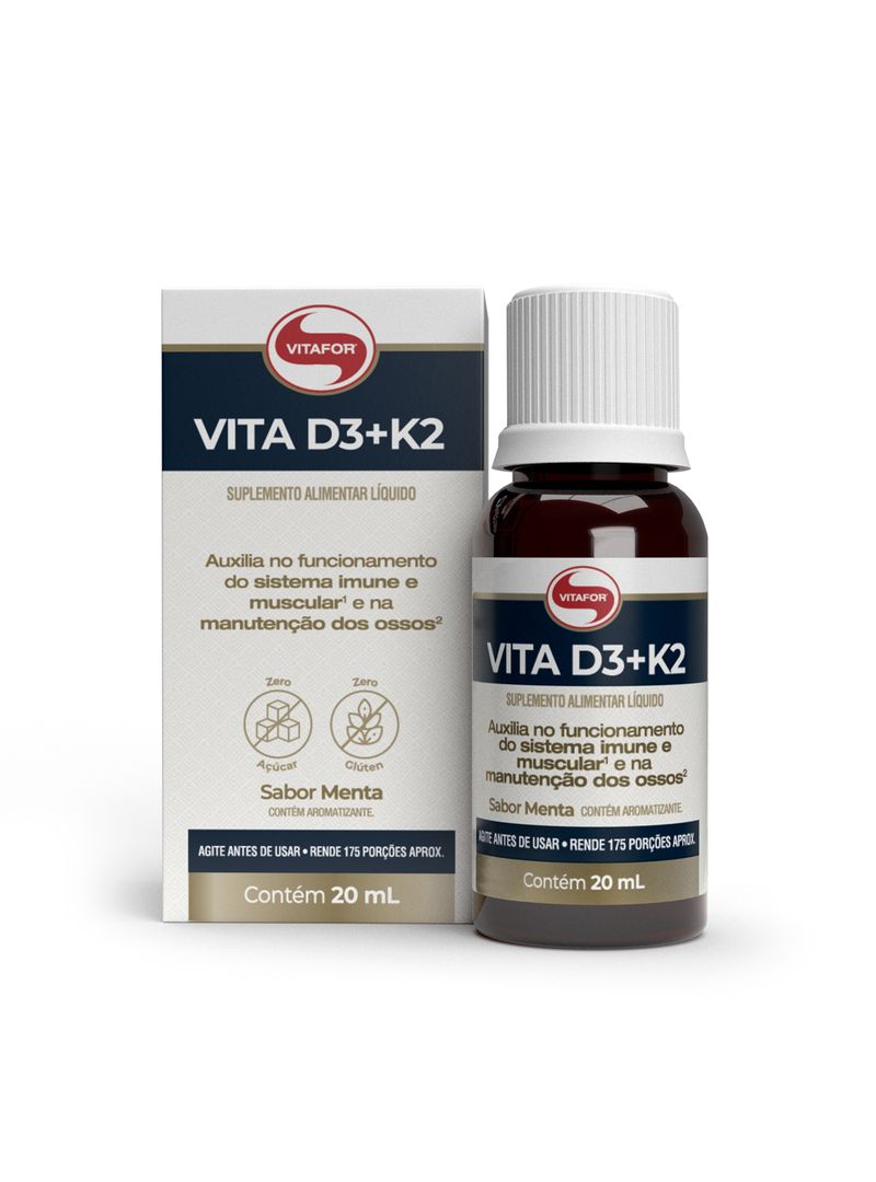 VITA D3 + K2® Vitafor é um suplemento alimentar rico em vitaminas D3 (colecalciferol) e K2 (menaquinona-7) e que possui alta concentração de D3 por dose (2.000 UI).