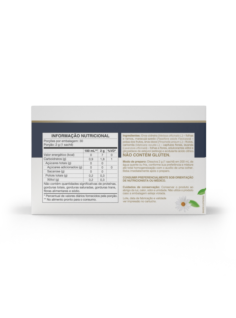 VITATEA® EQUILIBRIUM composto por lavanda, camomila, erva-doce, erva-cidreira e maracujá, edulcorantes naturais xilitol e glicosídeos de esteviol (estévia).