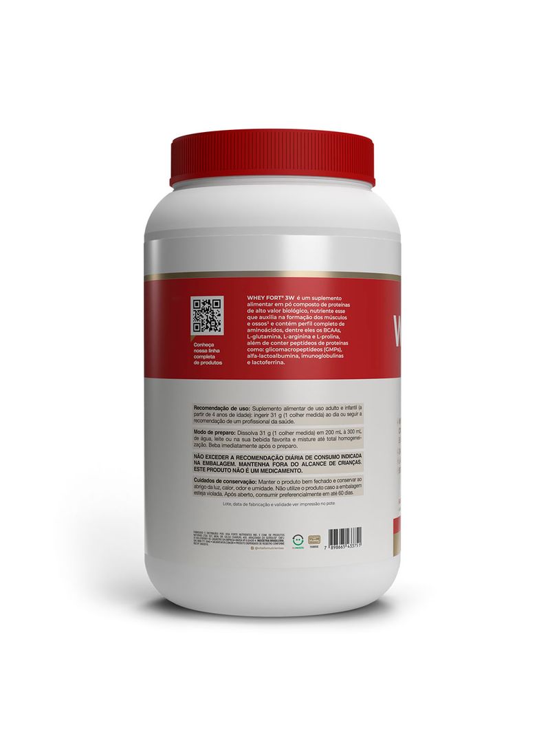 WHEY FORT ® 3W é um suplemento alimentar composto de proteínas de alto valor biológico, nutriente que auxilia na formação dos músculos e ossos. Contém perfil completo de aminoácidos, dentre eles os BCAAs, L-glutamina, L-arginina e L-prolina, além de conter peptídeos de proteínas como: glicomacropeptídeos (GMPs), alfa-lactoalbumina, imunoglobulinas e lactoferrina.